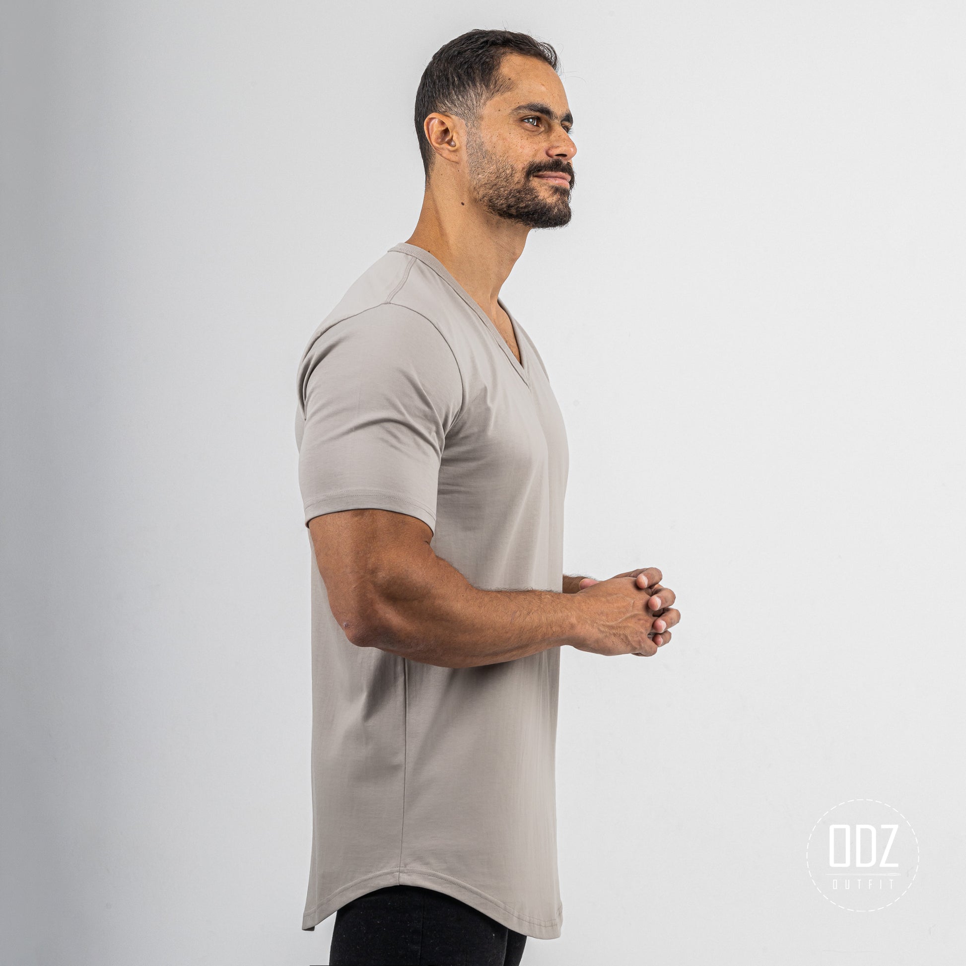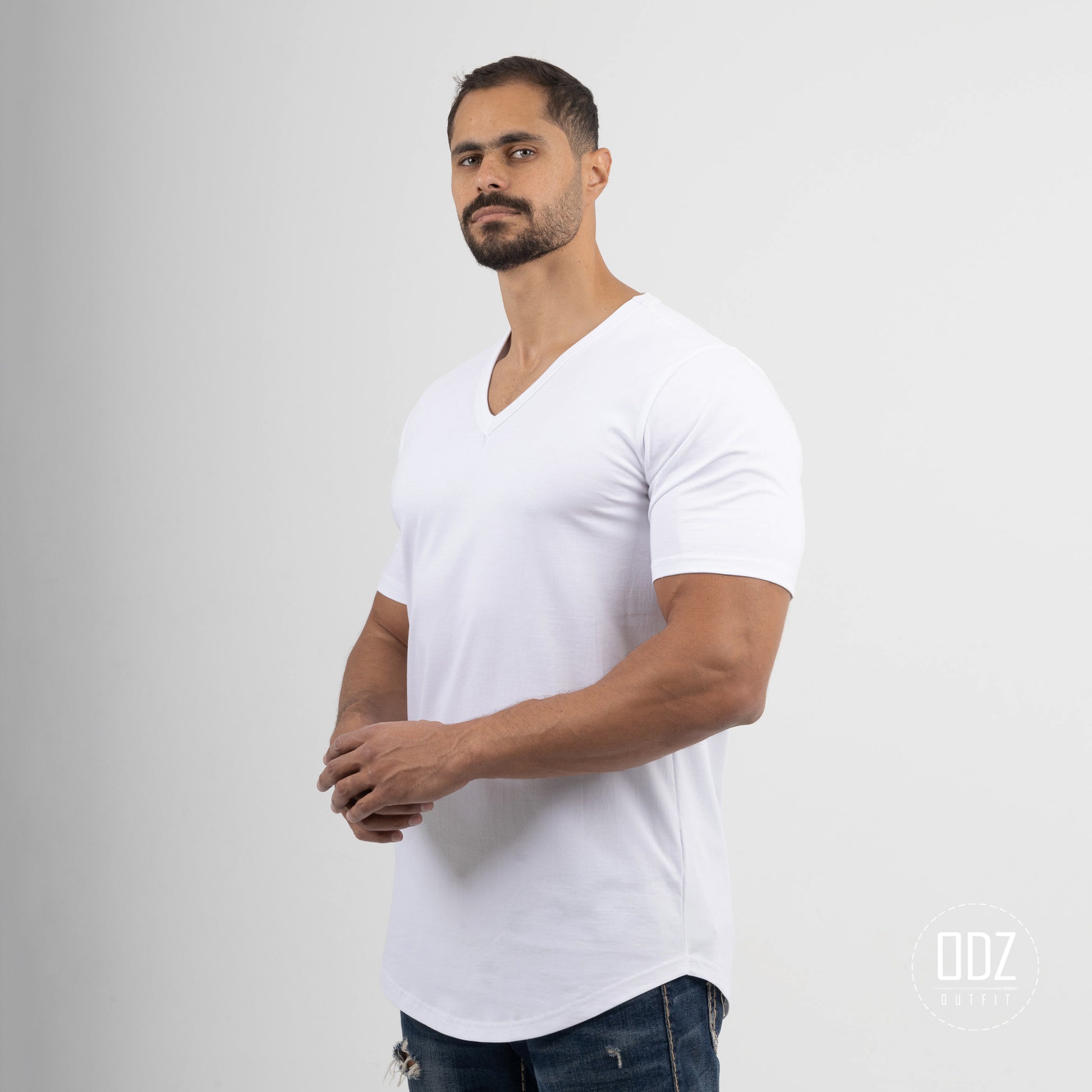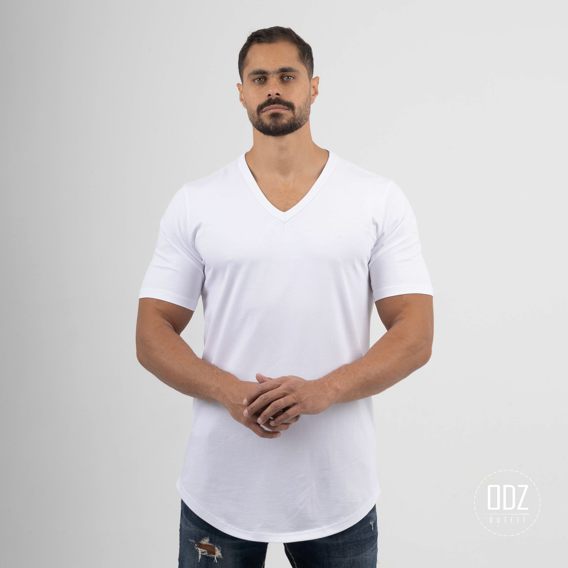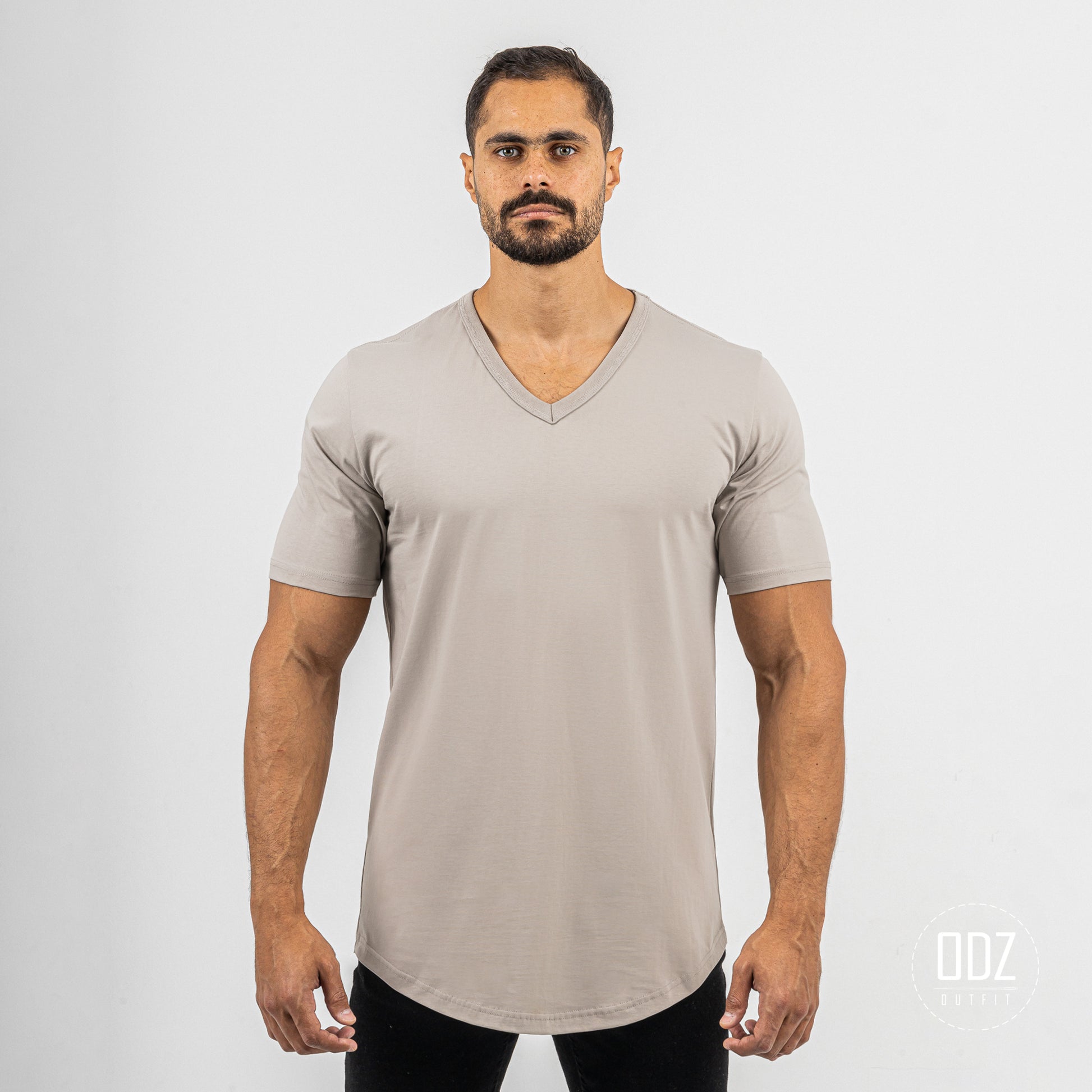Short sleeve T-shirt with a V neckline, and a curved bottom. A summer must-have.