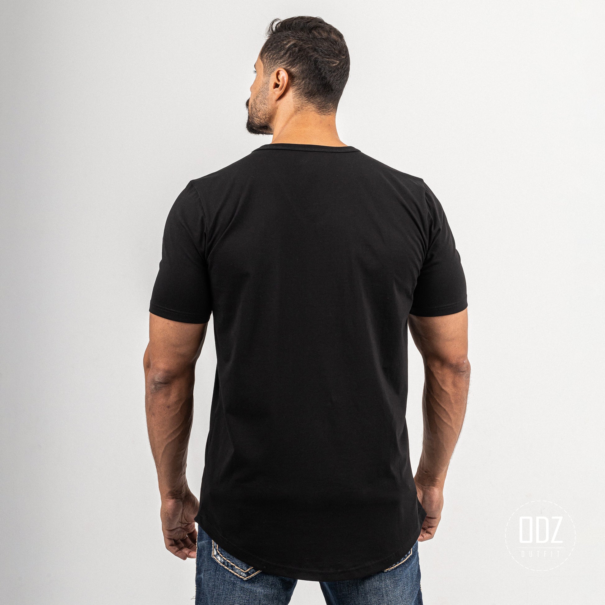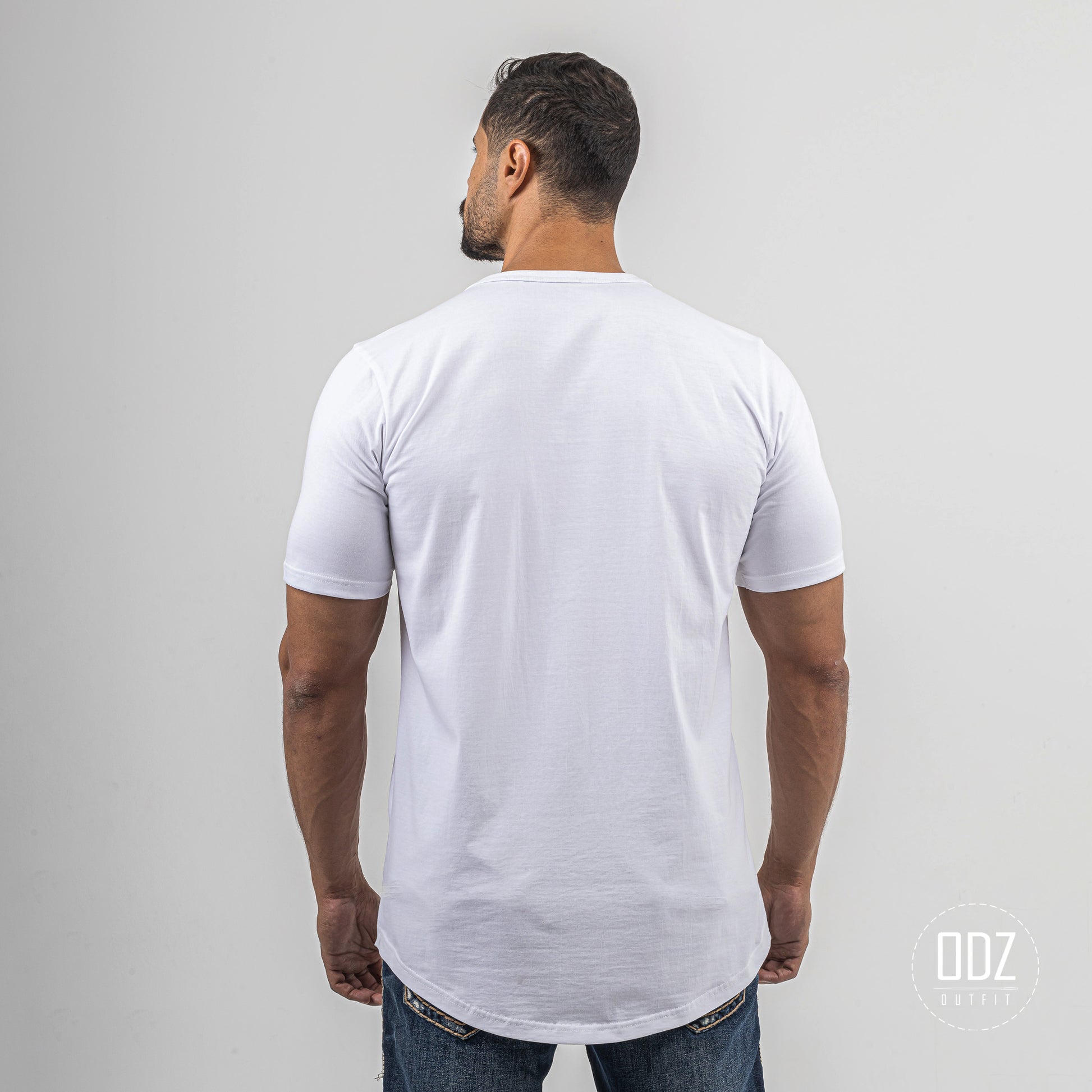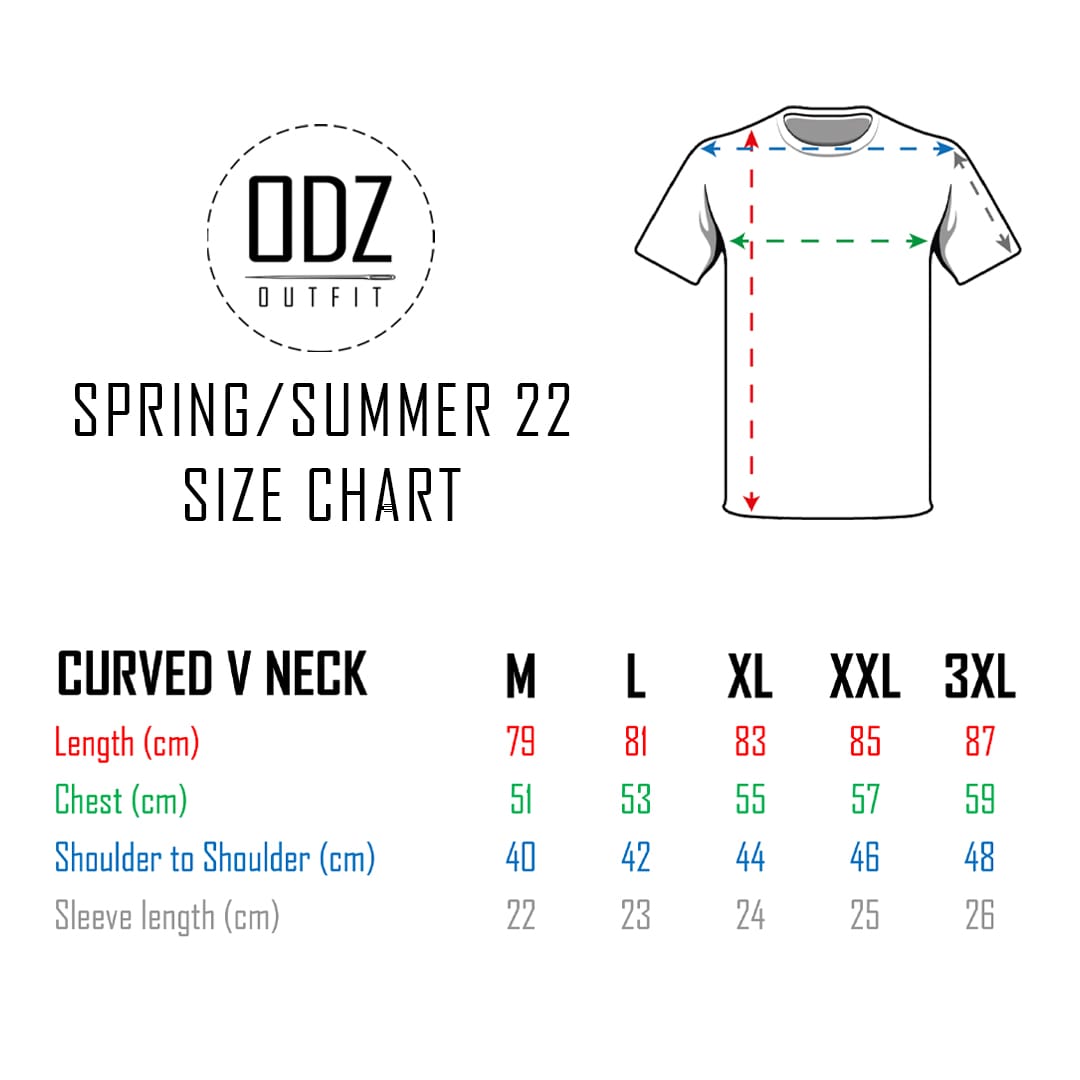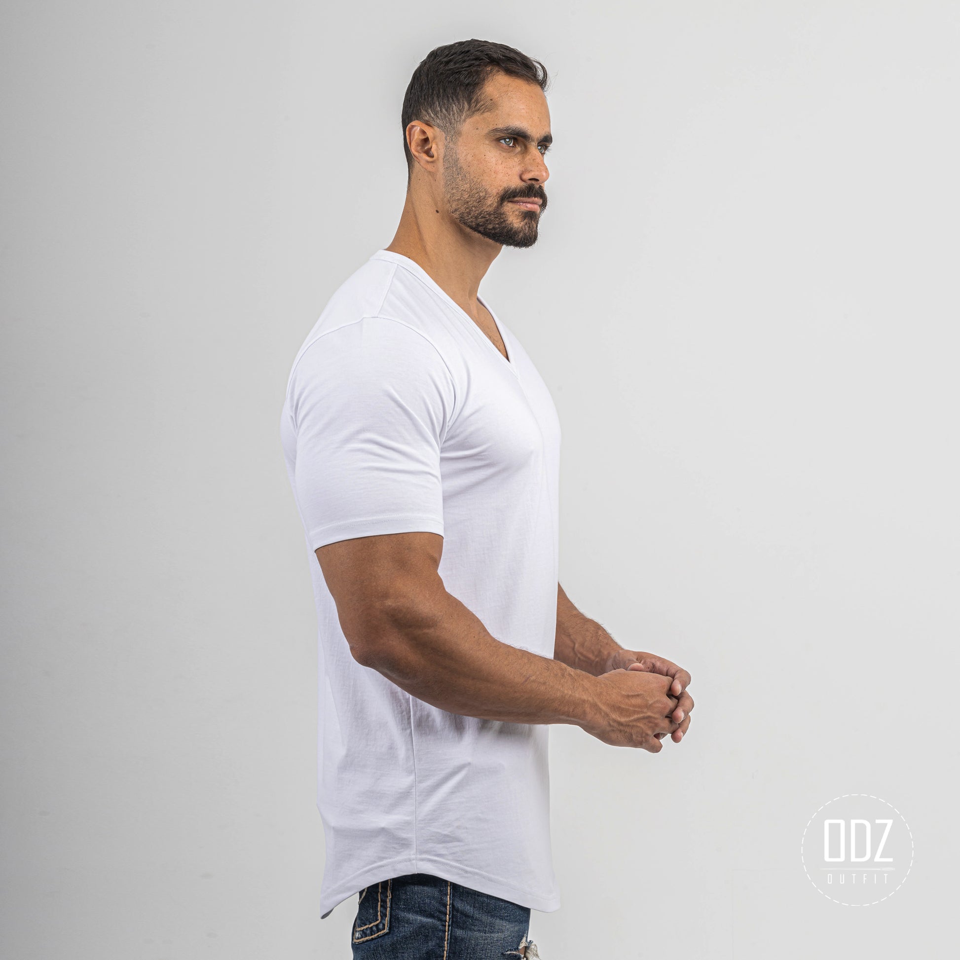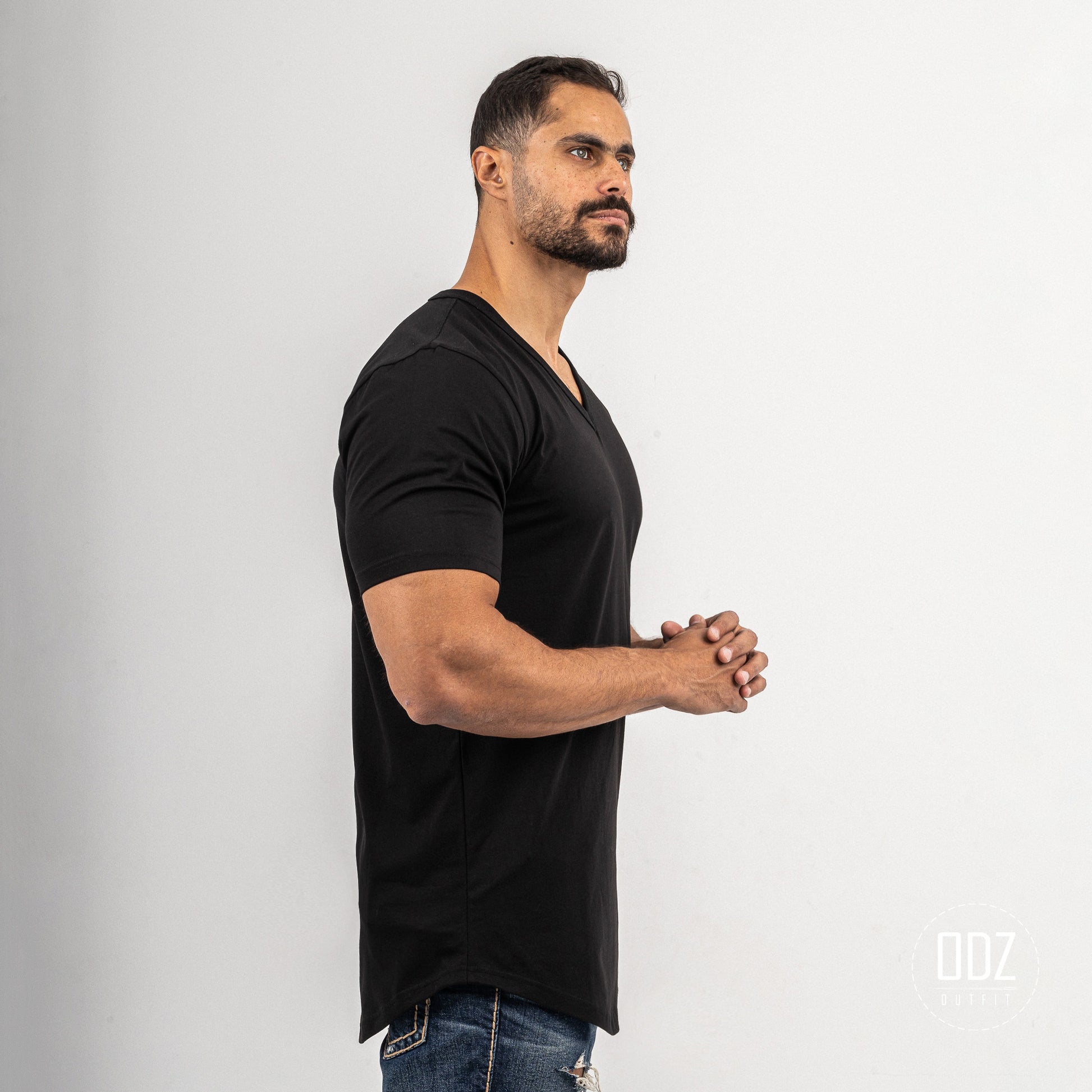Short sleeve T-shirt with a V neckline, and a curved bottom. A summer must-have.